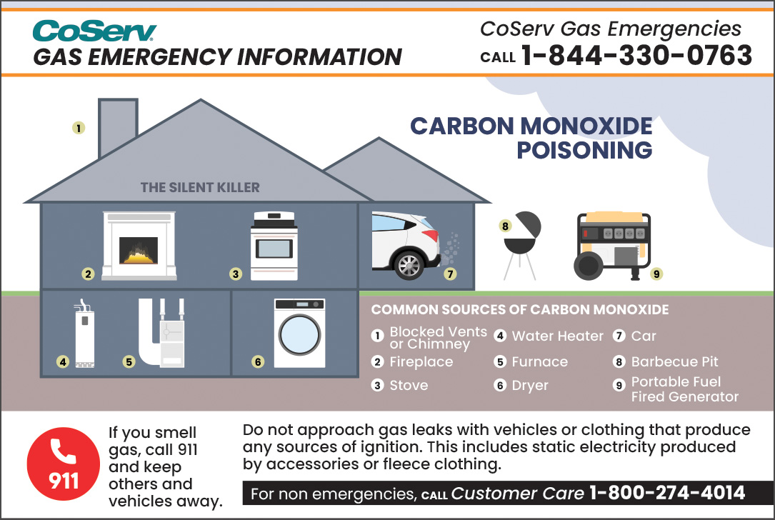 - Gas smell or hissing sound: If you smell rotten eggs or hear a hissing sound at the meter, call 911 and the CoServ Gas Emergency line (844-330-0763) immediately. They