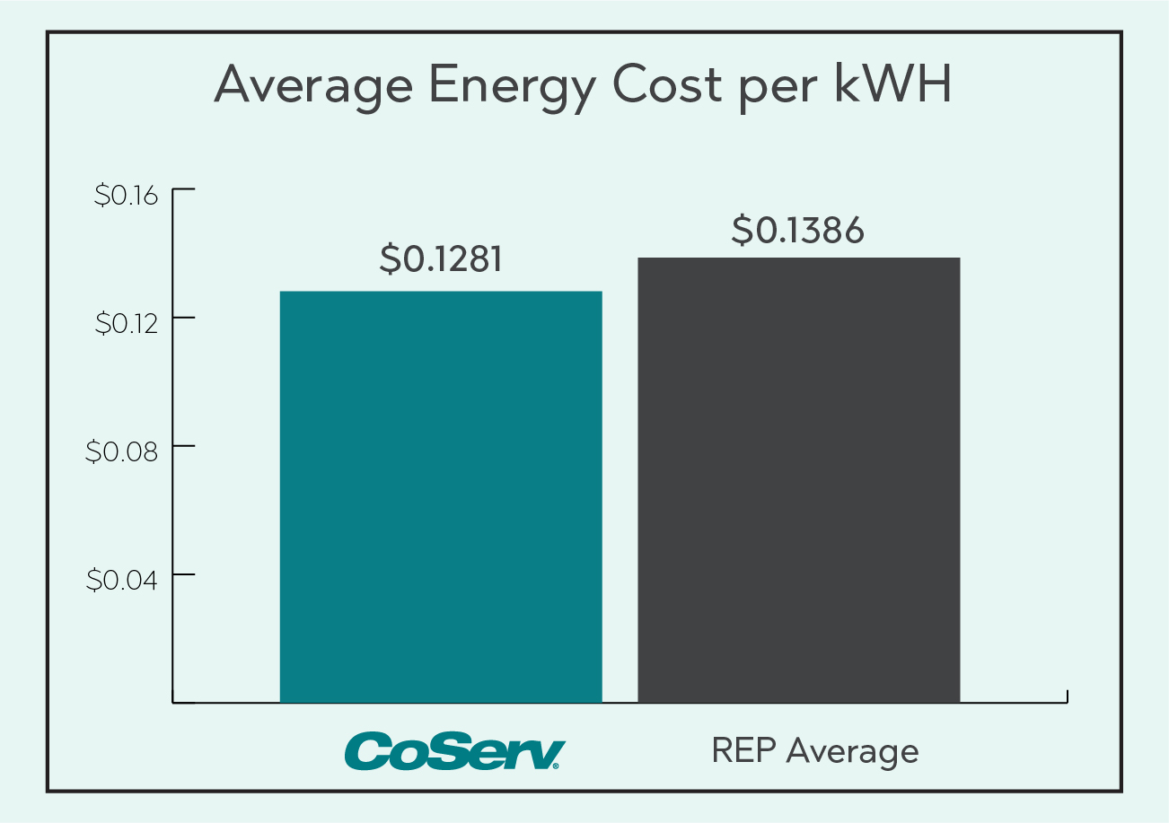 Our Members deserve reasonable and stable electric rates. Conversely, the mission of Retail Electric Providers (REPs) in the deregulated market is to generate investor profit. CoServ has no shareholders, and our responsibility is to our Members. Our Standard Residential Rate stays competitive with the 12-month fixed prices that REPs offer.