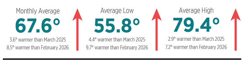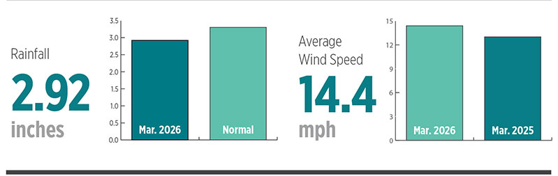 March was also marked by much-needed rainfall, with almost 3 inches recorded, one-third of an inch below normal. More than half the rain fell on March 4.