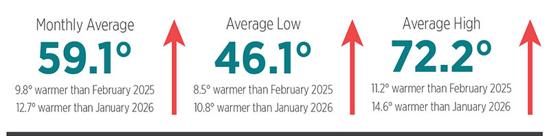 The last remnants of Winter Storm Fern gave a chilly start to February with lows in the 20s on Feb. 1, but it didn’t last. By Feb. 2, the highs were in the 70s, and the mild winter of 2025-2026 continued.